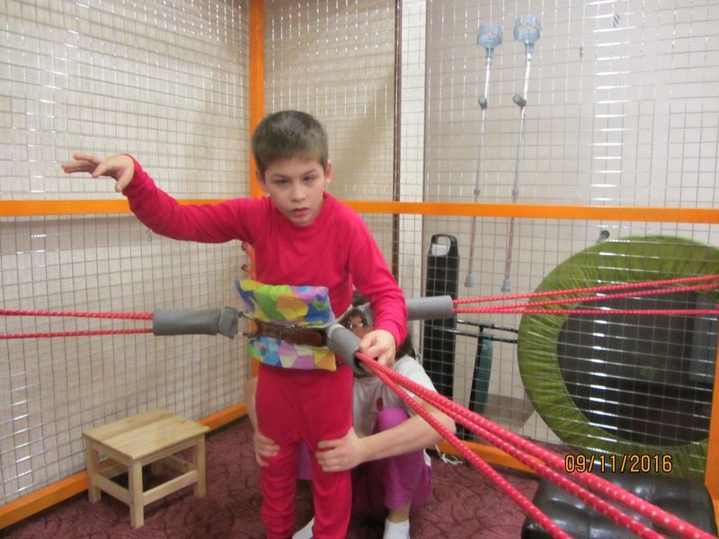 Занятия в костюме Адели, на который сделан основной упор в центре, очень подошли Саше. Занятия проходили в хорошем настроении, Саша с удовольствием выполнял все задачи, поставленные инструкторами. Очень радовался, что он может сам стоять. Так как костюм основан на резиновых тягах и эти тяги одеваются и подтягиваются таким образом, что формируется rтравильное положение спины, бедер, ног.